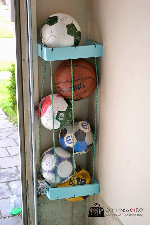 With a few pieces of scrap wood and bungee cords, you can DIY this ball storage for cheap! By using leftover items in your home, this useful storage idea can be made for under $2.