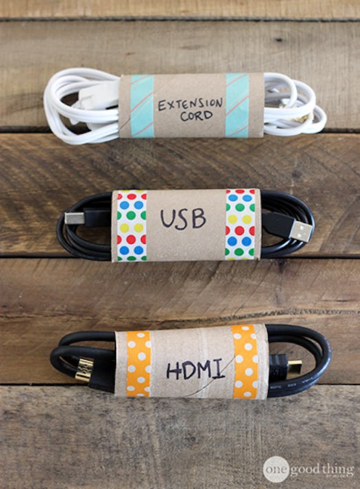Keep those pesky, tangled cords in order with this easy DIY cord organizer idea. Label and decorate toilet paper rolls to store your phone chargers, headphones, and extension cords.