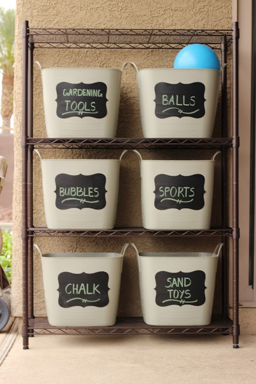 Looking for a place to store all of your outdoor toys? These DIY toy bins made from weatherproof tubs and chalkboard labels are the perfect solution to keeping gardening tools, sports equipment, and toys organized.