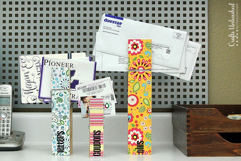 Instead of building a command center or mail organizer, keep your mail sorted with jumbo clothespins. Decorate and label different sizes of clothespins to separate your letters and coupons from your bills.