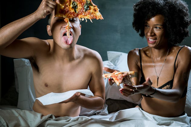 "Not only will you take cooking dinner (or whichever meal) off your partner’s to-do list, but also the gesture shows that you care and want [them] to feel better," Justin Lavelle, dating expert and Chief Communications Officer of online background check platform BeenVerified, tells Bustle. "Consider watching a movie while you eat to help distract your partner from his or her worries. A glass of wine may also help both of you relax."
