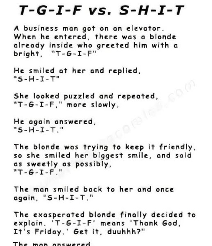 The man smiled back at her and once again, “S-H-I-T.”The exasperated blonde finally decided to explain. “‘T-G-I-F’ means ‘Thank God, It’s Friday!’ Get it, duuhhh?”