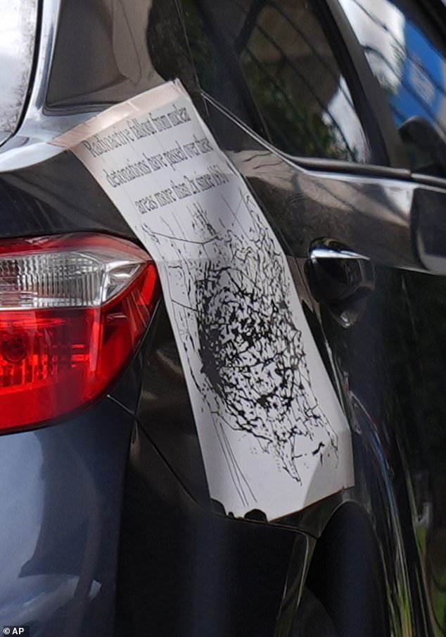 A horrifying poster appears to be taped to the side of the vehicle that investigators believe belonged to Dallas ICE shooting suspect Joshua Jahn.