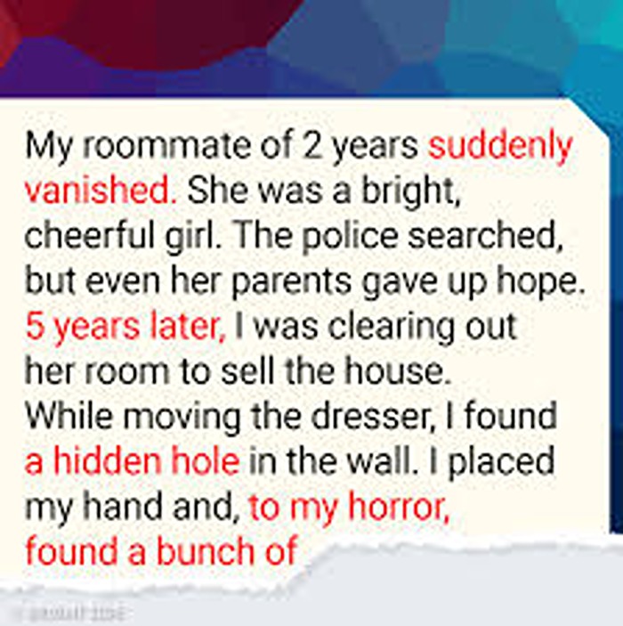 My roommate, who I lived with for 2 years, suddenly disappeared. She was a happy, cheerful girl. The police searched for her, but even her parents lost hope. Five years later, I was cleaning her room to sell the house. When I moved the dresser, I found a hidden hole in the wall. I put my hand inside and, to my horror, I found a bunch of notes that said, “If I ever disappear, you need to urgently look for me at Jake’s cabin in the mountains.”