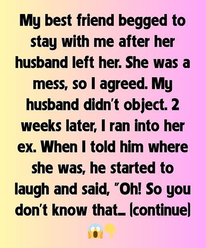 When my best friend showed up at my door after her marriage fell apart, I didn’t hesitate to let her stay. She was devastated, and I wanted to be there for her. My husband agreed she could use our guest room, and for a while, everything seemed fine. She kept to herself, healing quietly, while I tried to make our home a safe place for her to recover. I thought I was simply helping a friend through one of the hardest chapters of her life.