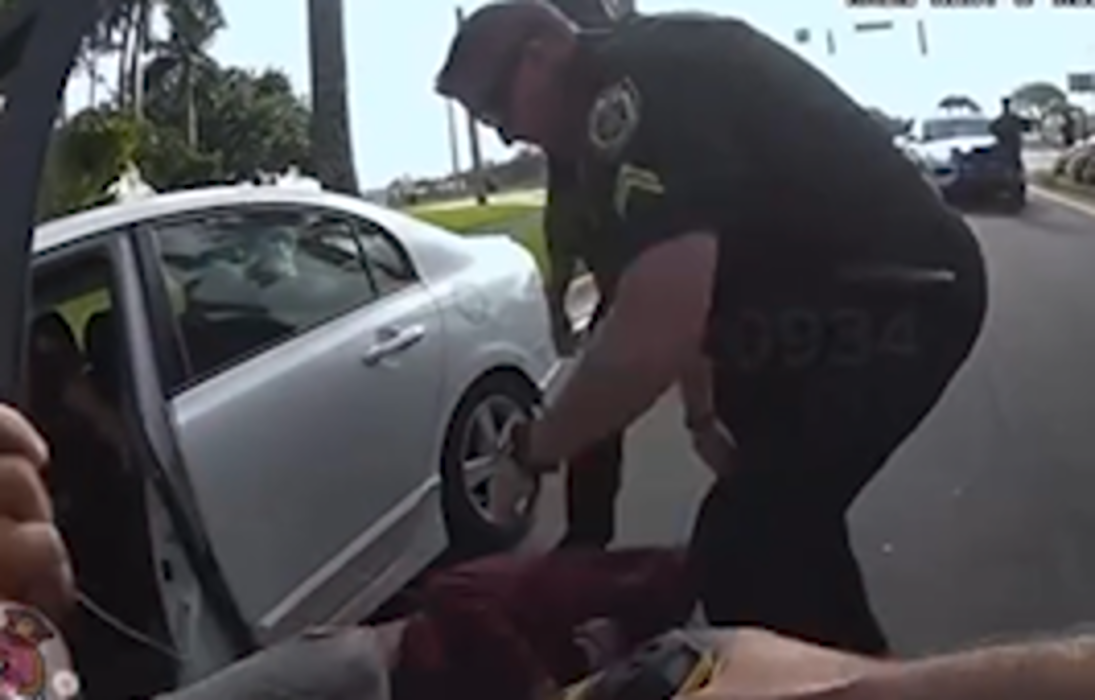The footage, which appears to be from an officer’s body-worn camera, shows a white sedan stopped on the side of a busy roadway. At least two officers are seen detaining a man near the open driver’s side door, with one officer forcefully grabbing the individual as they pull him out of the car.