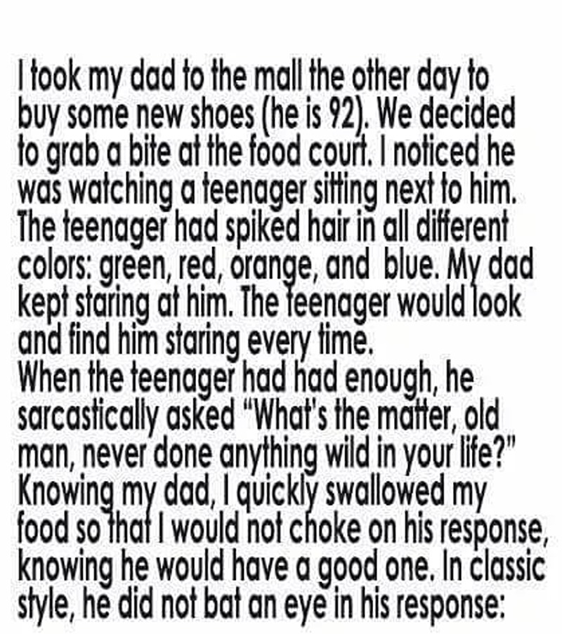 “What’s the matter, sir? Never done anything fun in your life?” I held my breath, knowing my dad’s wit was sharper than ever despite his age.
