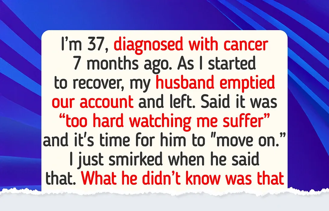 I’m 37, diagnosed with cancer 7 months ago. As I started to recover, my husband emptied our account and left. Said it was “too hard watching me suffer” and it was time for him to “move on.” I just smirked when he said that.