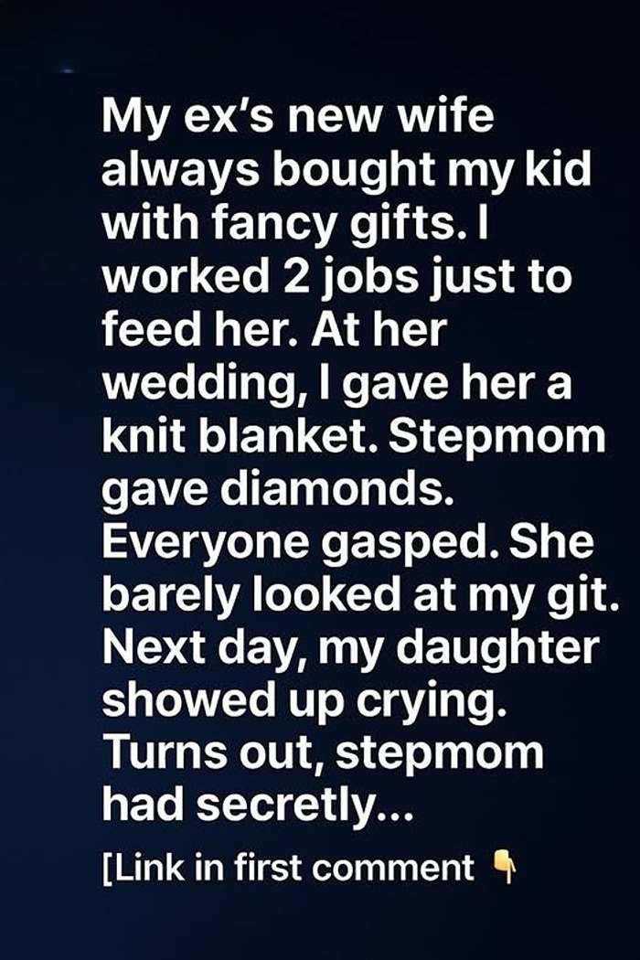 When my daughter got married, I spent months knitting a soft blanket with my own hands. It wasn’t glamorous, but every stitch carried a piece of my heart. At the wedding, her stepmother presented her with a sparkling diamond set.