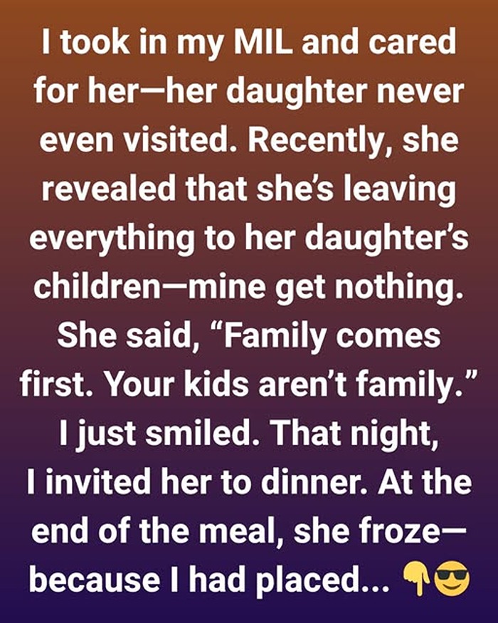 One afternoon, she casually mentioned she was leaving everything to her daughter’s children. Mine, she said, would receive nothing. “Family comes first,” she told me firmly. “And your children aren’t really family.” The words stung, but I kept calm. I reminded myself that kindness is never wasted, even when it isn’t acknowledged.