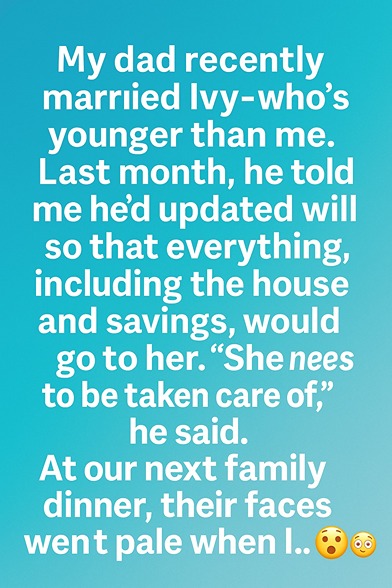 At our next family dinner, their faces went pale when I calmly stood up, cleared my throat, and said, “Dad, I have something to share too.”