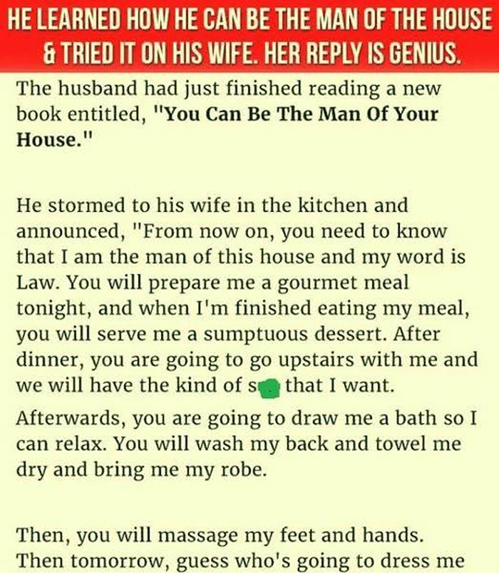The husband had just finished reading a new book entitled, “You Can Be The Man Of Your House.” He stormed to his wife in the kitchen and announced, “From now on, you need to know that I am the man of this house and my word is Law. You will prepare me a gourmet meal tonight, and when I’m finished eating my meal, you will serve me a sumptuous dessert. After dinner, you are going to go upstairs with me and we will have the kind of s** that I want. Afterwards