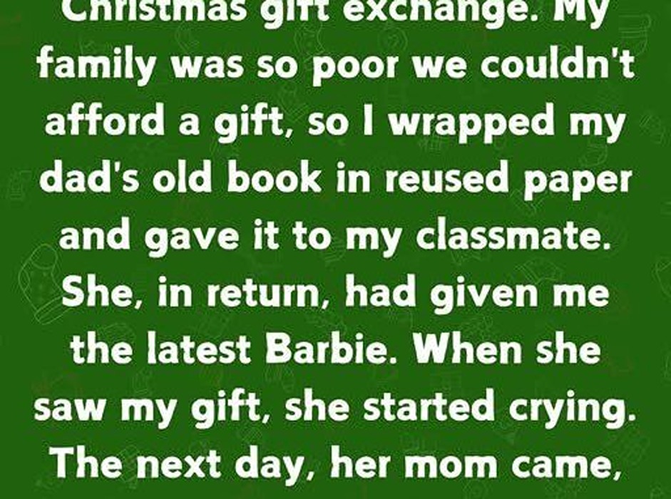 My family was so poor we couldn’t afford a gift, so I wrapped one of my dad’s old books in reused gift paper and gave it to my classmate.