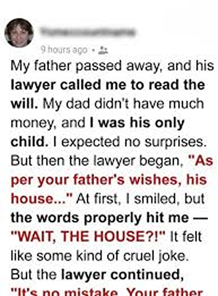 I thought I was prepared for everything the day my father’s lawyer called me in to read the will. My dad had never been wealthy, and as his only child, I assumed the process would be simple—maybe a few personal belongings and keepsakes. But when the lawyer began reading and said, “As per your father’s wishes… his house…” I felt my breath catch. His house? The home I grew up in? I sat there stunned, realizing there was a part of his life—and his love—that I never knew about. In that moment, I understood this was more than paperwork. It was a final message he had quietly prepared for me.