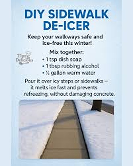 A simple do-it-yourself mixture can help make winter maintenance easier. This easy recipe uses just three ingredients—dish soap, rubbing alcohol, and warm water—items most households already have on hand. To create the solution, combine one teaspoon of dish soap, one tablespoon of rubbing alcohol, and half a gallon of warm or hot water. After stirring gently, pour the mixture over icy steps, walkways, or driveways. The warmth helps loosen the ice, the alcohol slows refreezing, and the soap adds a bit of traction. Unlike traditional road salt, this mixture is less likely to harm concrete, plants, or shoes, making it a practical option for families who want a safer and more surface-friendly alternative to chemical de-icers.