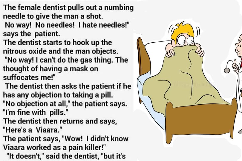 This joke plays on the patient’s extreme aversion to needles and gas, leading the dentist to a tongue-in-cheek suggestion involving Viagra, which is not a painkiller. The punchline, implying that the Viagra is intended to give the patient something to “hold onto” during the procedure, is a humorous and unexpected twist, blending medical humor with an element of surprise. It’s a classic example of a setup where the solution to one problem (pain management) is presented with a twist that takes the listener in a completely different, amusing direction.