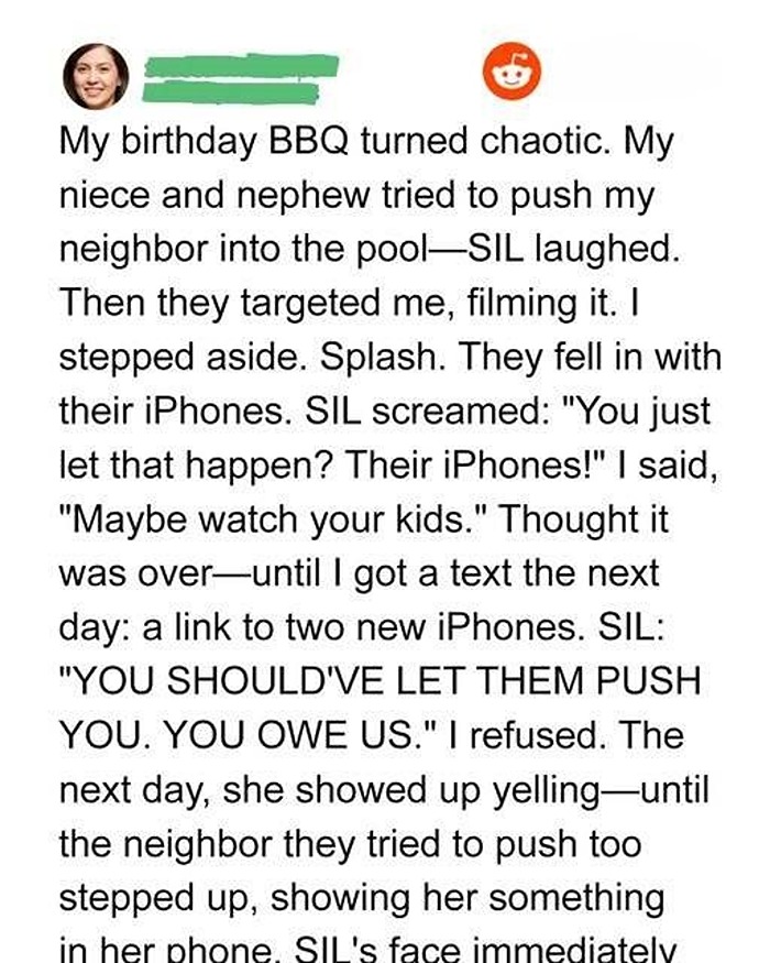 I let out a dry, humorless laugh. The absolute audacity. She really thought I was responsible for her kids’ phones because I didn’t let them push me into the pool?