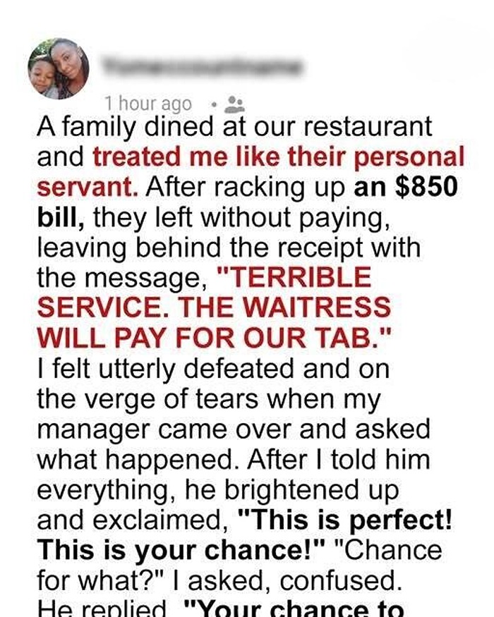 When a family skipped out on their $850 restaurant tab, I was devastated. But with my manager’s shrewd plan and an unexpected ally, we turned the tables in a way they never saw coming.