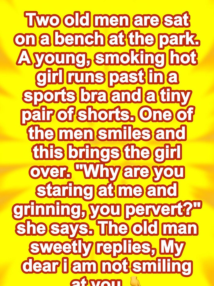 A gorgeous young woman jogs past in tiny shorts and a sports bra. Frank breaks into this huge grin. The girl notices, slows down, and comes over looking annoyed.
