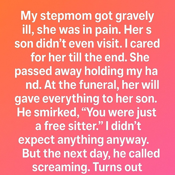 It wasn’t addressed to him—it was addressed to me. In it, she thanked me for caring for her with patience and kindness when she felt most vulnerable. She wrote that while she couldn’t change her will without causing family conflict, she hoped her words would remind me that what I gave her mattered more than anything she could give in return.
