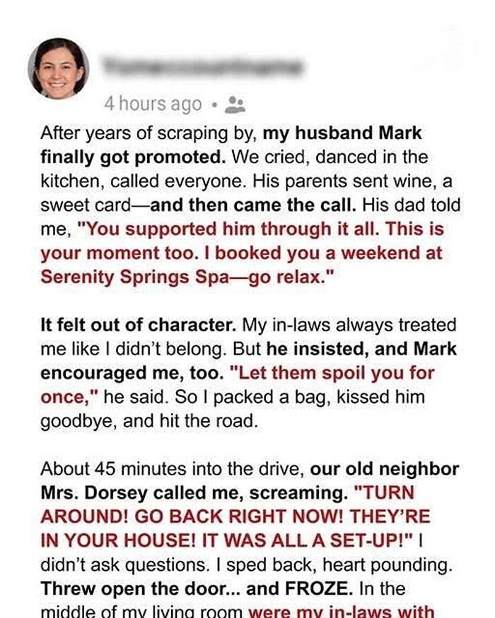 I used to believe milestones softened people. When Mark got his promotion, I believed it even more. We cried on the kitchen floor, danced barefoot with sticky palms, called everyone who’d ever rooted for us. His parents sent Merlot and a card with embossed doves. Then Bashir called me. “You supported him through it all,” he said, voice warm enough to melt granite. “This is your moment, too. I booked you a weekend at Serenity Springs. Go. Let us spoil you.”…CONTINUE READING IN BELOW