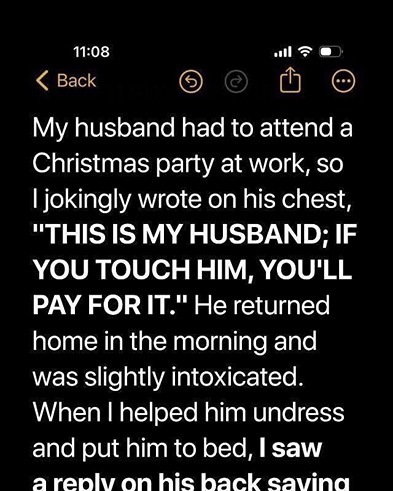 It started as a lighthearted prank, just something fun to send my husband off to his work party with a laugh. But when he stumbled home drunk and I found a reply to my joke scrawled on his chest, it became clear that this night was about to change everything. It’s strange, isn’t it? How you can be with someone for years, trust them wholeheartedly, and then suddenly question everything? I never thought I’d be that person: the one who starts second-guessing her marriage. But here I am, wondering how things got to this point…..CONTINUE READING IN BELOW