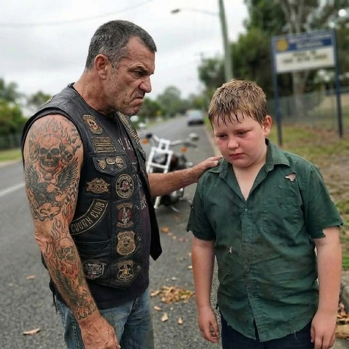 I found him on a lonely stretch of Rural Route 12 — a ten-year-old boy walking with his head down, his shirt torn, his knuckles scraped, and his face blotched with the quiet kind of crying kids learn too young. He flinched when I approached, a big bearded biker in a leather vest, but the fear in his eyes wasn’t for me. It was for the things he wouldn’t say. When I asked what happened, all he managed was “nothing” before the truth spilled out in trembling pieces: two years of bullying, stolen bus money, cruel taunts about his mother working two jobs, and the daily dread of tomorrow. But the part that broke me wasn’t the bruises. It was his whispered plea — “Please don’t tell my mom… she already cries every night.”