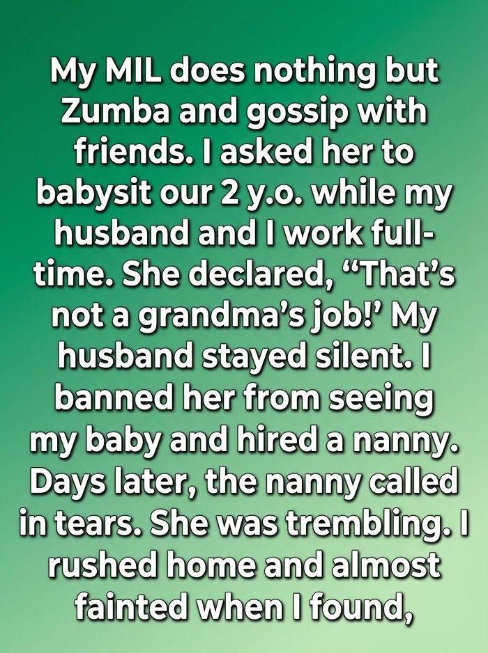 My MIL does nothing but Zumba and gossip with friends. I asked her to babysit our 2 y.o. while my husband and I work full-time. She declared, “That’s not a grandma’s job!” My husband stayed silent. I banned her from seeing my baby and hired a nanny.