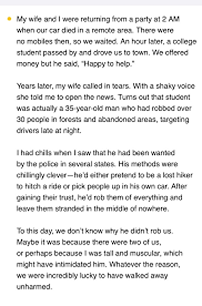 I hope our story makes you think. If it reminds you of a time when someone helped you or when you narrowly avoided danger, let that experience guide your choices moving forward. Life is unpredictable, and sometimes the biggest lessons come from the strangest situations.
