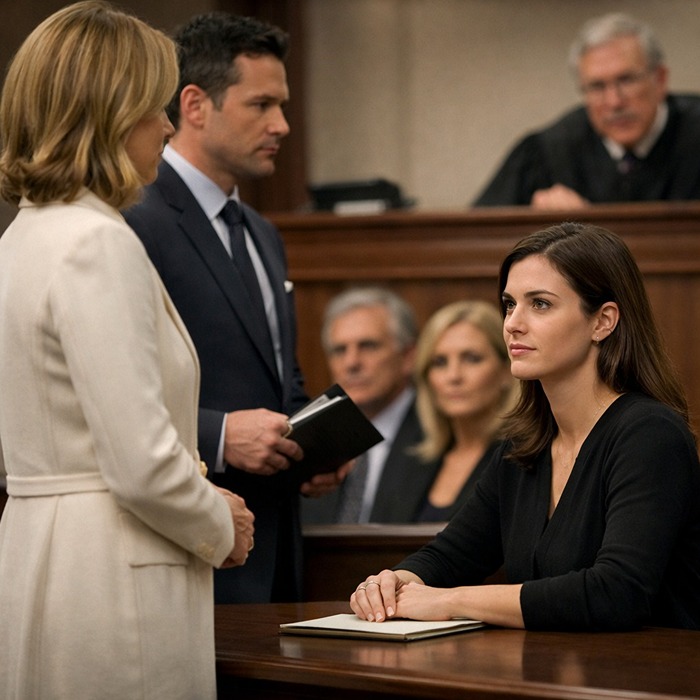 Her attorney glided up beside her, all gleaming shoes and understated cologne, an expensive watch that flashed when he moved. He carried a slim folder of documents like they were a foregone conclusion. When he reached counsel table, he slid the papers forward with the motion of someone pushing a knife across a table.