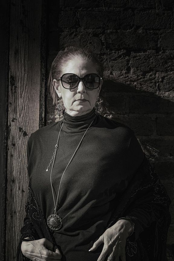 She stood between the tall columns, a smile stretched across her face, her sunglasses still on, but her head tilted in our direction like she was trying to see us through the dark.