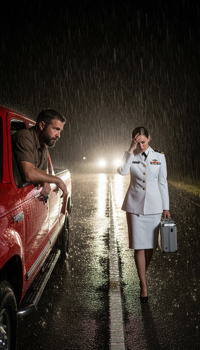 Outside the naval administrative building, a dark government sedan sat crooked near the curb, its hazard lights blinking with the worthless rhythm of a failing battery. Beside it stood a woman, soaked through, her hand braced against the door as if the rain were an excessive force trying to push her into the asphalt. Marcus hesitated. He was tired, invisible, and late. But he saw the way her hand trembled—a forensic clue of distress that his instincts as a former combat medic couldn’t ignore. He pulled over his beat-up pickup, jumping into the deluge to perform a reallocation of reality for a stranger.