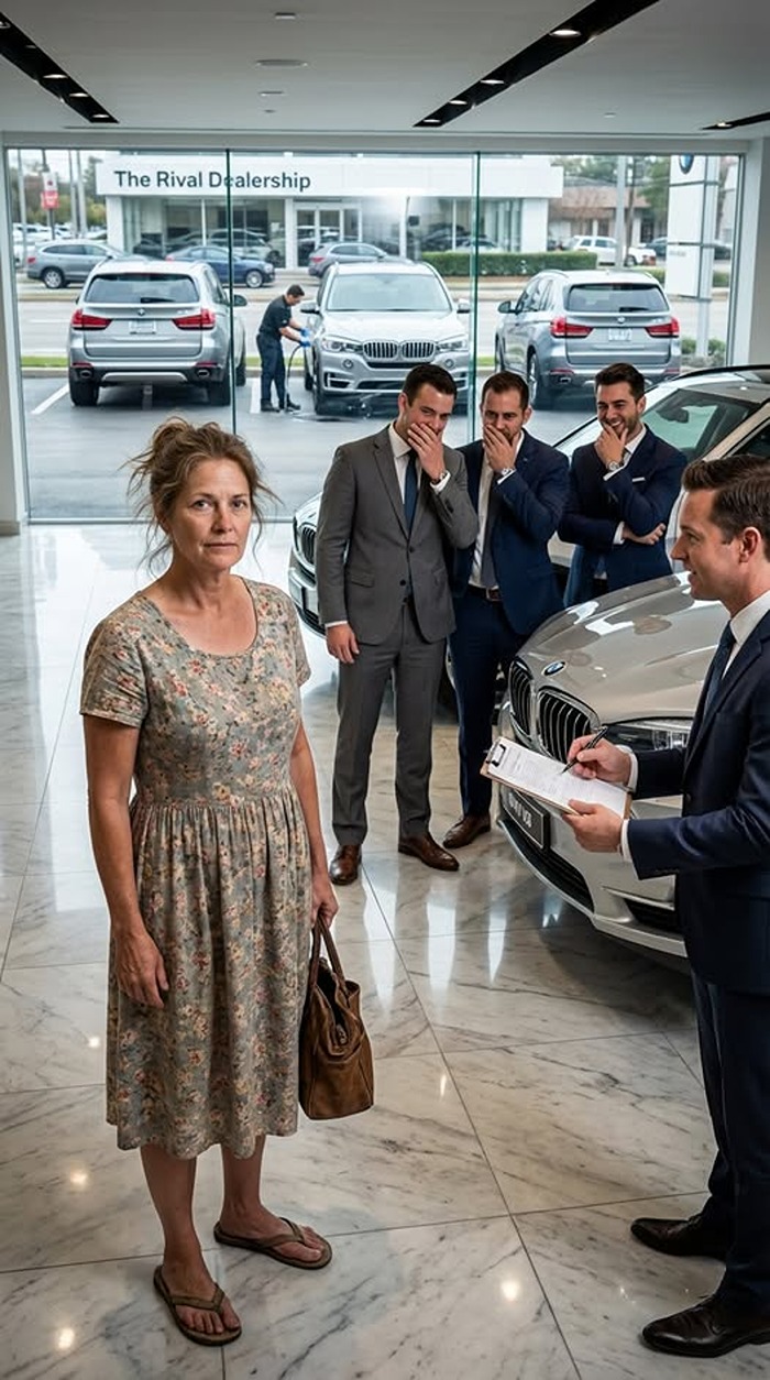 The air conditioning at Apex Motors hit Mary like a physical wall, carrying the artificial scent of ozone and expensive cologne. Behind the elevated mahogany reception desk stood Julian, a salesman whose silver nametag was as polished as his condescending smirk. Julian performed a rapid, ruthless autopsy of Mary’s appearance. He took in the dust on her toes and the lack of a designer handbag, concluding that she was a “lost vagrant” escaping the Texas heat.