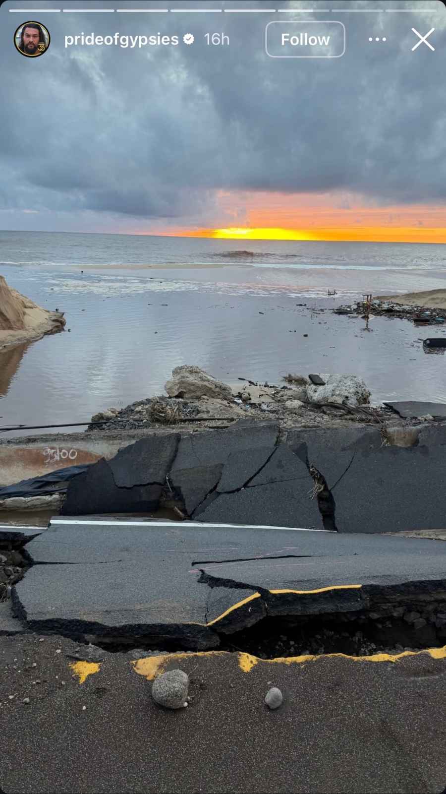 On Saturday, Momoa shared several photographs of the devastation the flooding has caused on the North Shore, including a video of debris being pushed up onto the beach and images of destroyed roads.